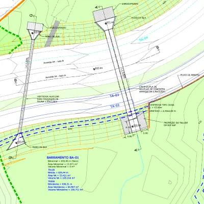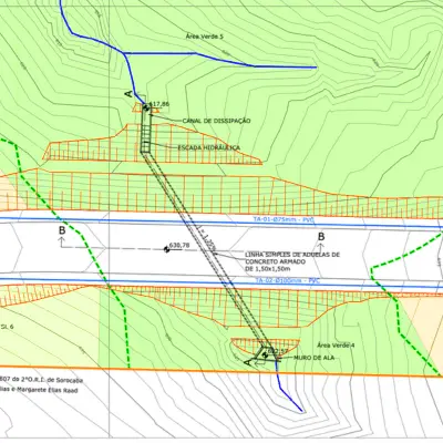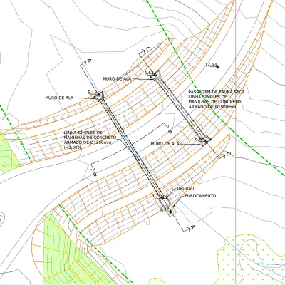 Dimensionamento de travessia viária para a passagem segura de veículos e pedestres, garantindo conectividade, fluidez e segurança no tráfego.